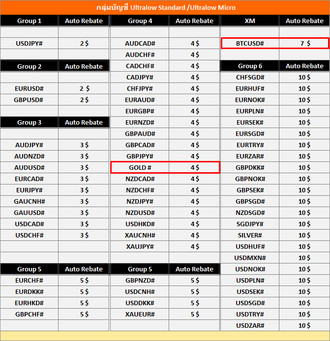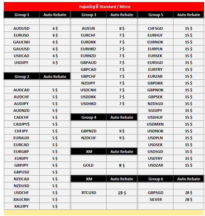 ตามตารางช่อง Auto Rebate แสดงถึงอัตราคืนเงินรีเบต ต่อ 1 Lot เทรดของท่าน