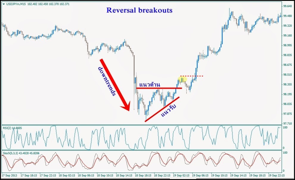 2. Reversal breakouts แนวโน้มราคาซื้อขายที่อยู่ในช่วงกลับตัวอย่างรวดเร็วจะอยู่ในช่วง downtrends หรือ uptrends ก็ได้