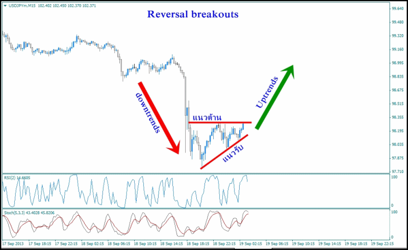 2. Reversal breakouts แนวโน้มราคาซื้อขายที่อยู่ในช่วงกลับตัวอย่างรวดเร็วจะอยู่ในช่วง downtrends หรือ uptrends ก็ได้